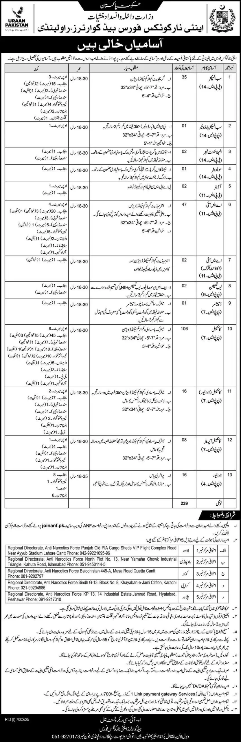 Applications are invited from Pakistani nationals who meet the required criteria for recruitment in Anti Narcotics Force ANF.
