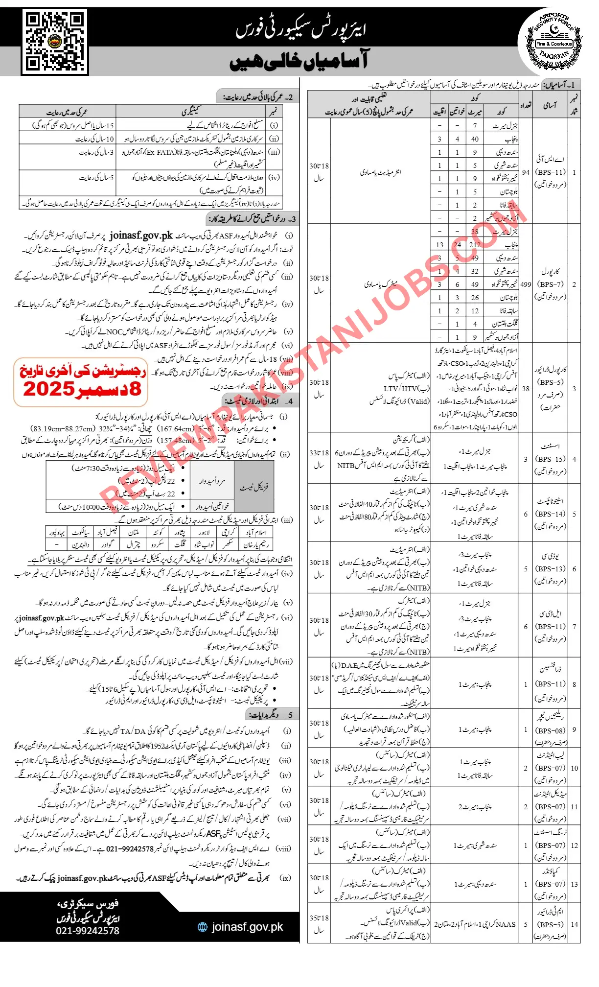 ASF has opened several posts for both uniform and civilian categories. Major vacancies include: