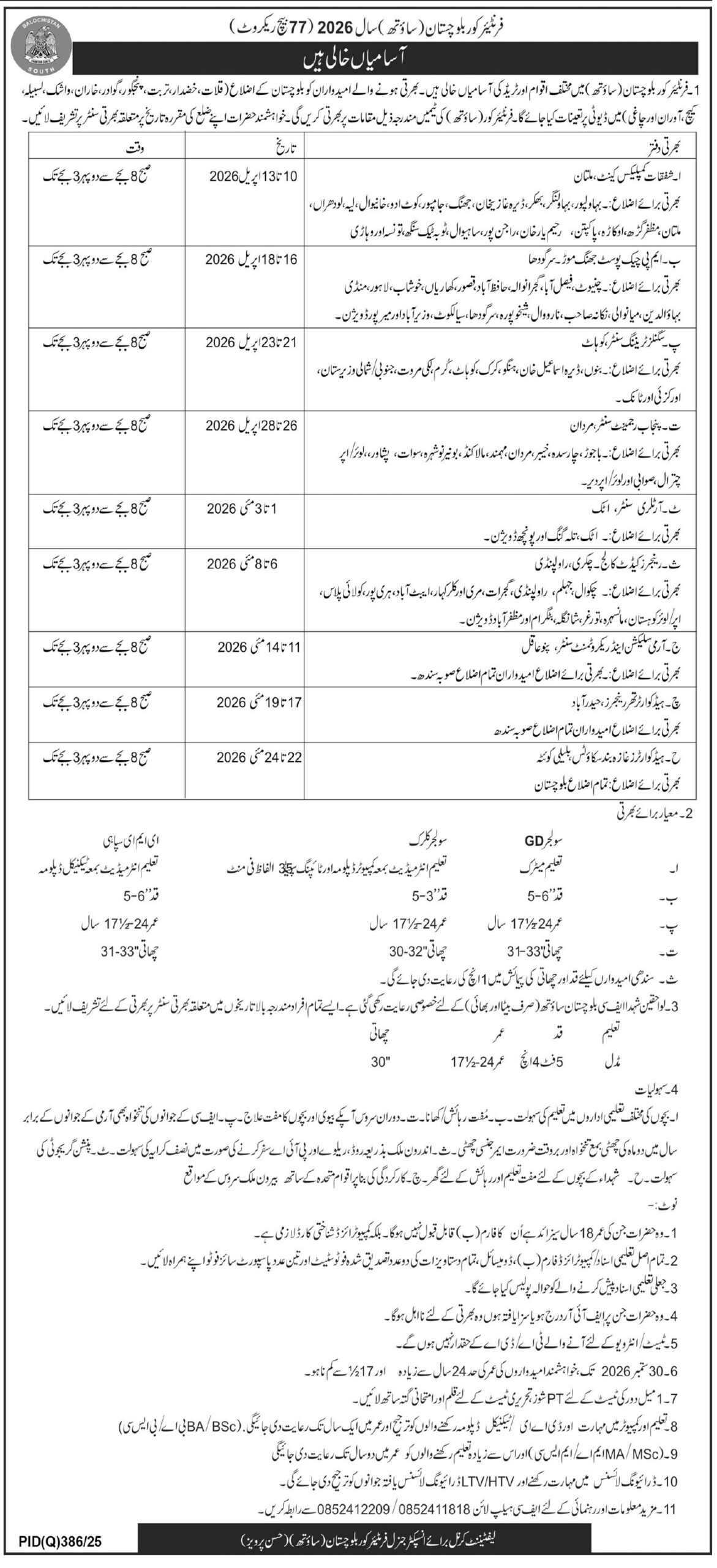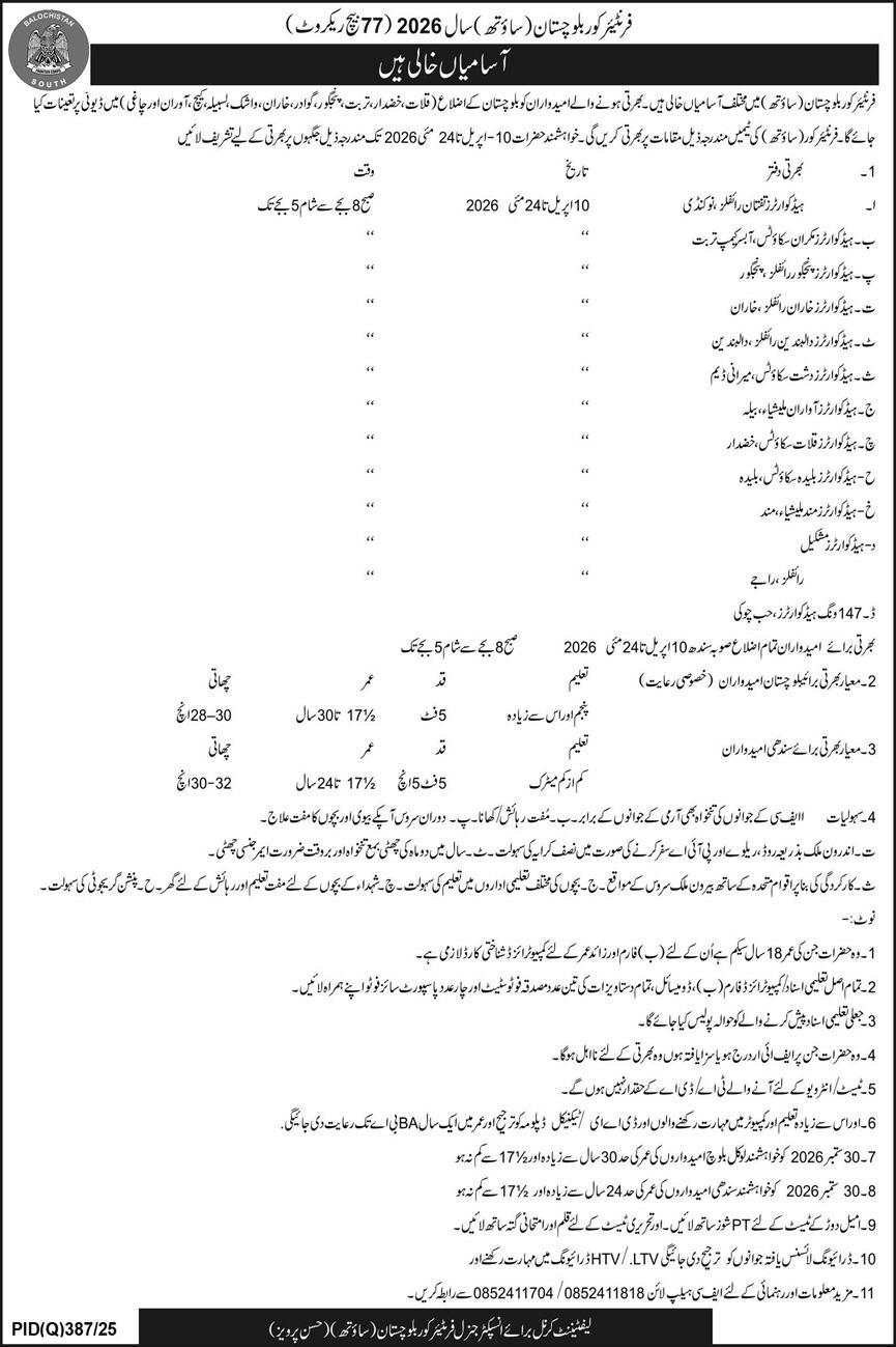 Frontier Corps Balochistan (South) has officially announced Recruitment Batch 77 (2026), offering a great opportunity for the youth of Balochistan and Sindh to serve the nation and build a secure career.