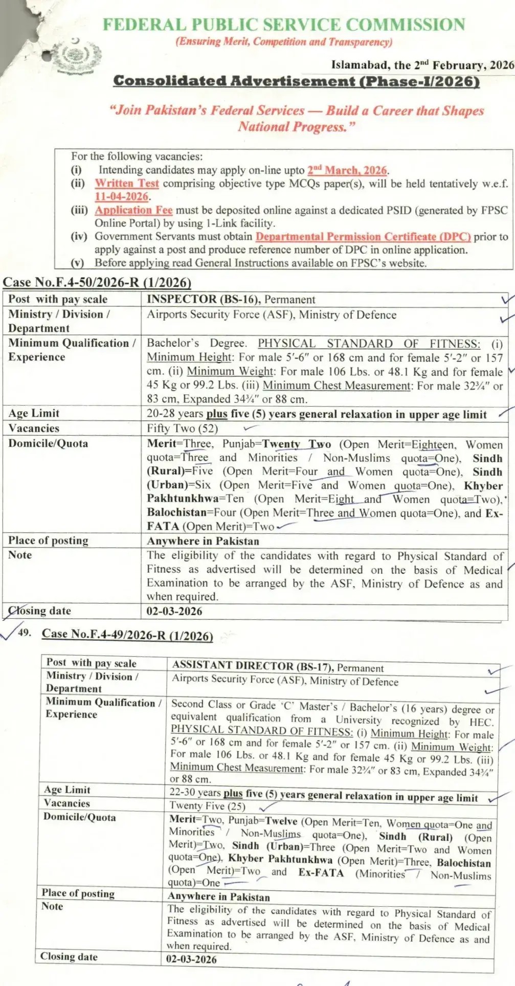 The Federal Public Service Commission (FPSC) has released Consolidated Advertisement Phase-I/2026, announcing excellent career opportunities in the Airports Security Force (ASF), Ministry of Defence. Candidates looking for prestigious federal government jobs should not miss this opportunity to build a strong professional future while serving the country.