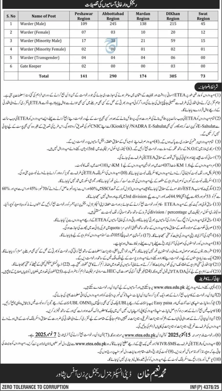 The Khyber Pakhtunkhwa (KPK) Jail Department has officially announced multiple vacancies for Male and Female Warders and Gate Keepers in various regional offices across the province. These government job opportunities are open for eligible, active, and disciplined candidates who are residents of Khyber Pakhtunkhwa. The recruitment process will be managed through the Educational Testing and Evaluation Agency (ETEA).