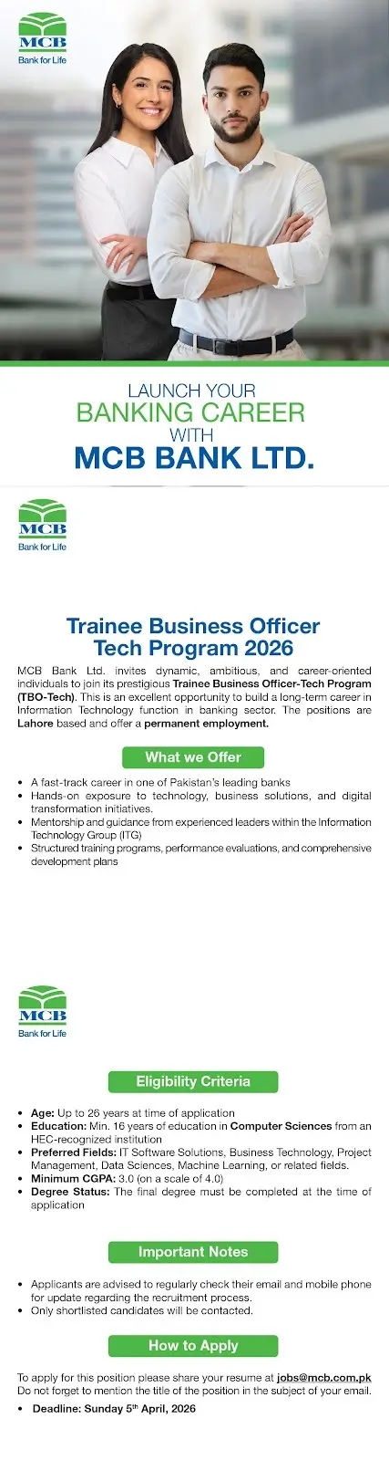 MCB Bank Limited has announced the Trainee Business Officer β Tech Program 2026, offering an excellent opportunity for IT graduates to build a long-term career in the banking sector.