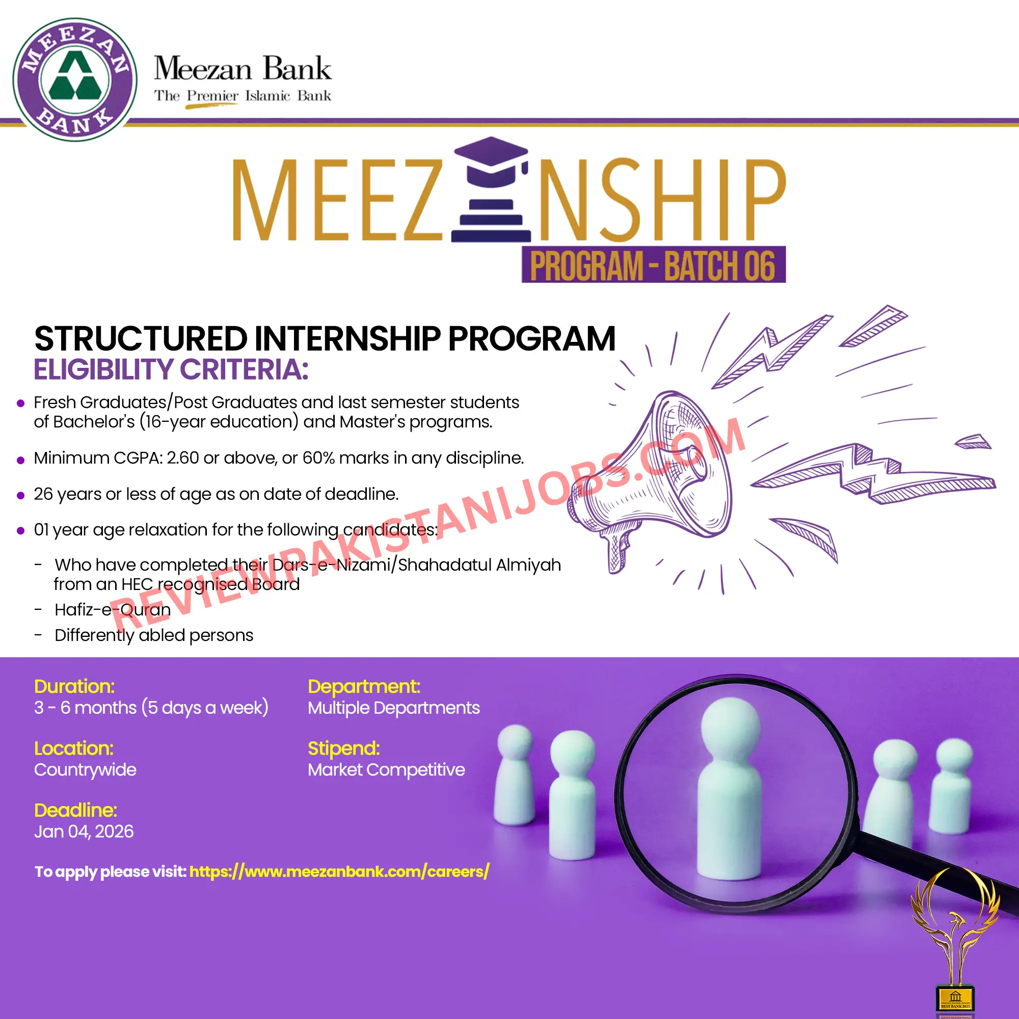 Meezan Bank, known as The Premier Islamic Bank of Pakistan, has officially announced its highly awaited Meezenship Program Batch 06 for the year 2026. This structured internship program is designed for fresh graduates, post graduates, and last semester students who want to start their professional journey in the Islamic banking sector.