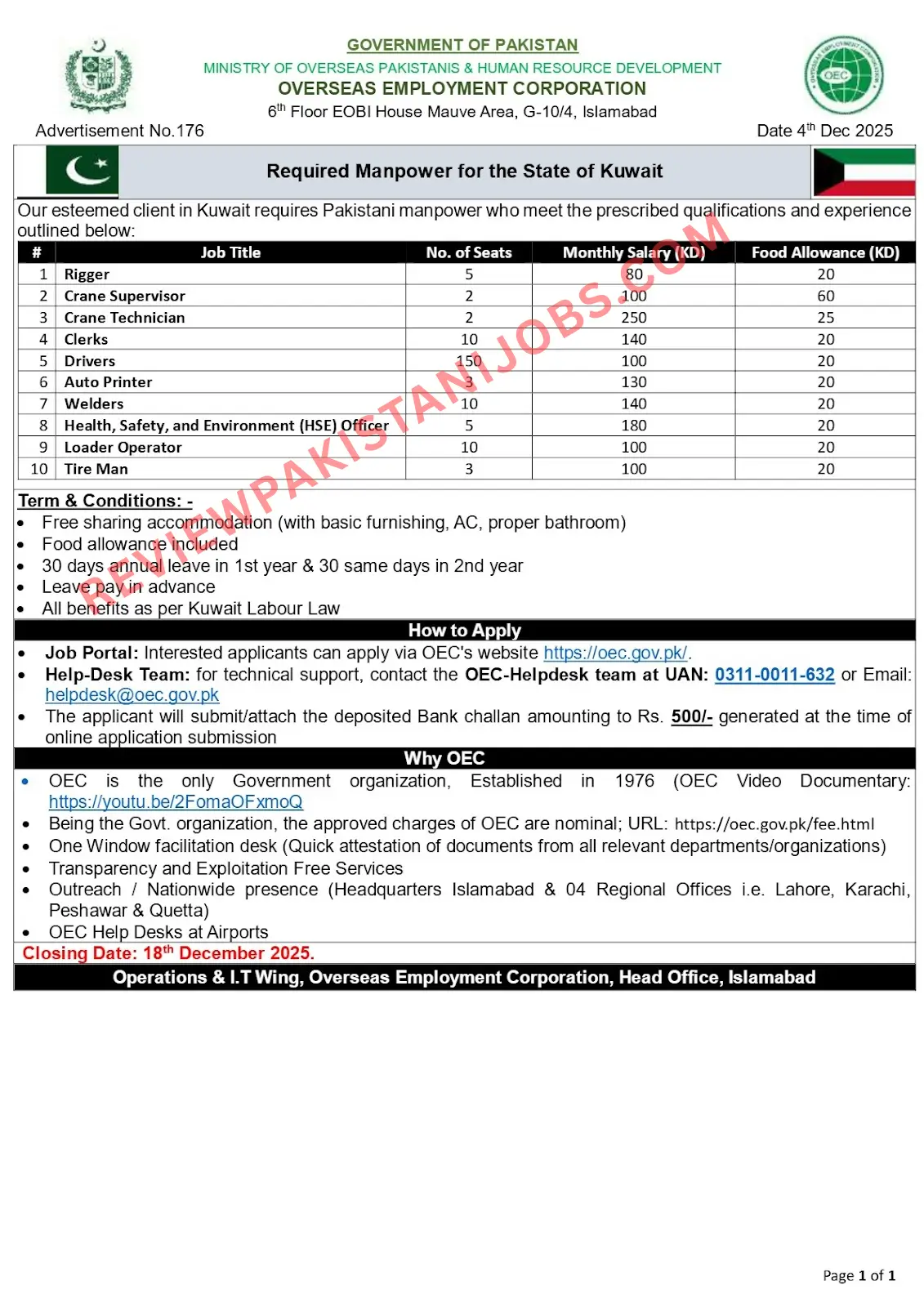 OEC Kuwait Jobs 2025 for Pakistani Workers, Online Apply Before Closing Date