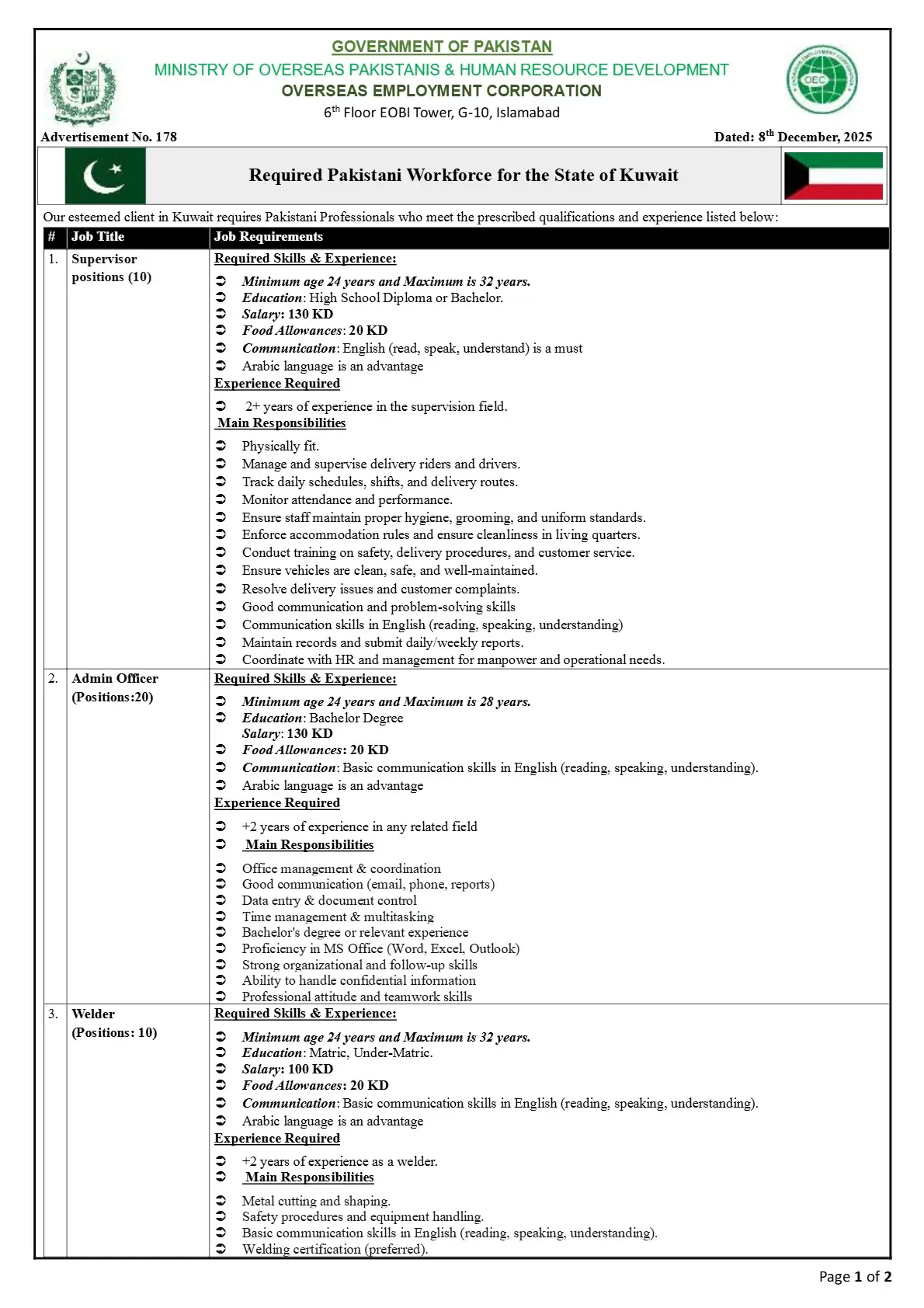 Government of Pakistan, Ministry of Overseas Pakistanis and Human Resource Development through Overseas Employment Corporation OEC has announced new job opportunities for Pakistanis in Kuwait. Skilled and experienced manpower is required in multiple categories with attractive salaries and benefits as per Kuwait Labour Law.