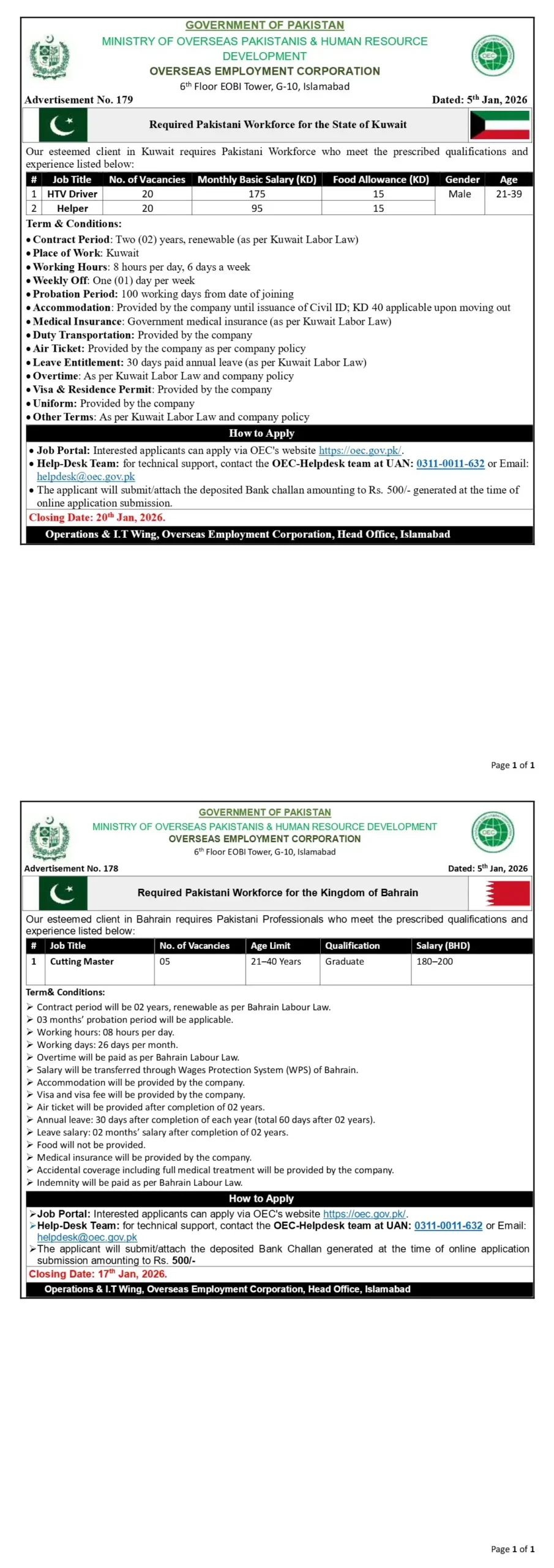 According to Advertisement No. 179 dated 5 January 2026, OEC has announced vacancies for Pakistani workforce required by an esteemed company in the State of Kuwait.