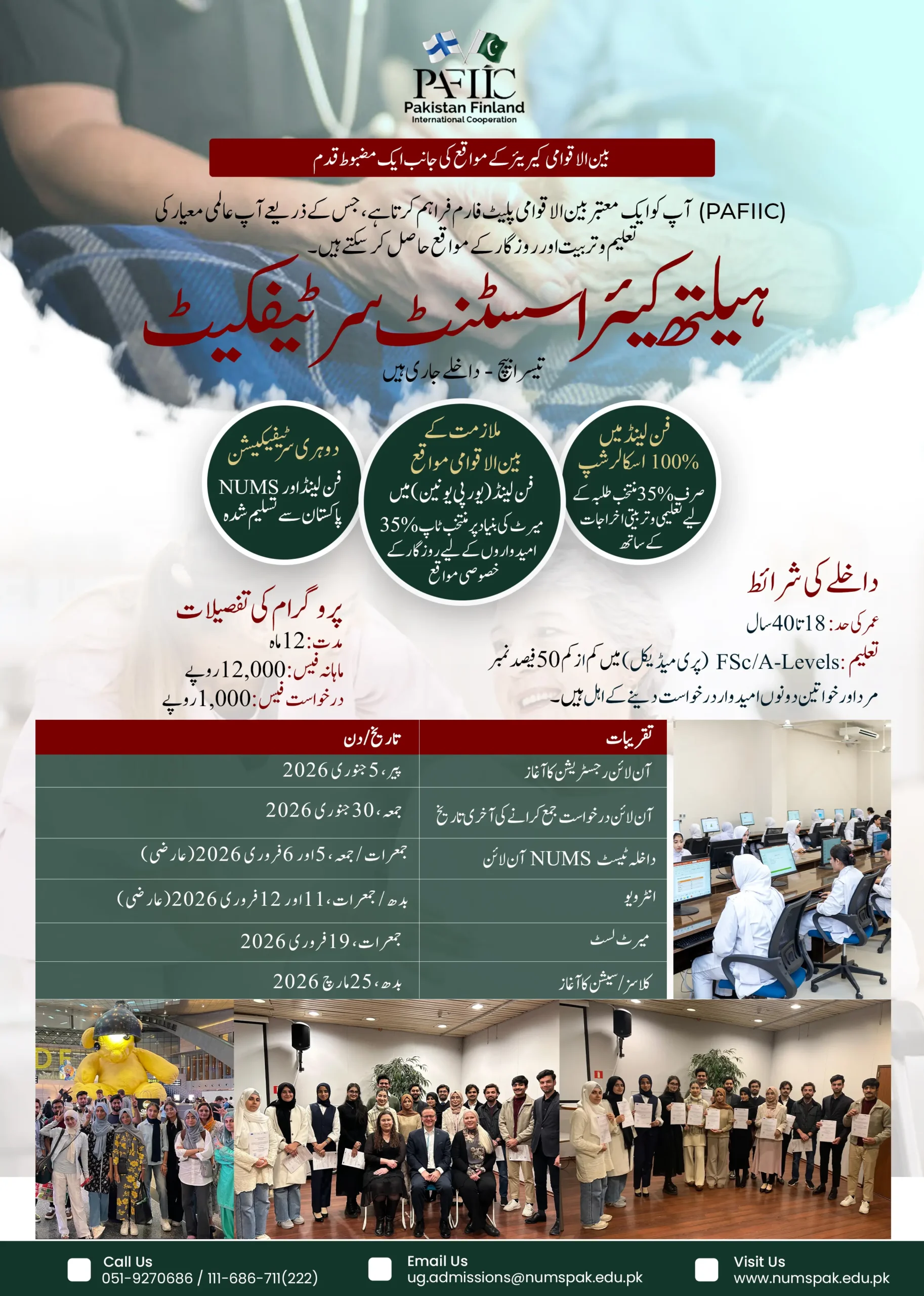 PAFIIC offers a reliable and recognized international platform where selected candidates can gain world class education, hands on training, and globally accepted certification. Through collaboration with Finland and National University of Medical Sciences (NUMS) Pakistan, this program ensures quality education and strong career outcomes for deserving candidates.