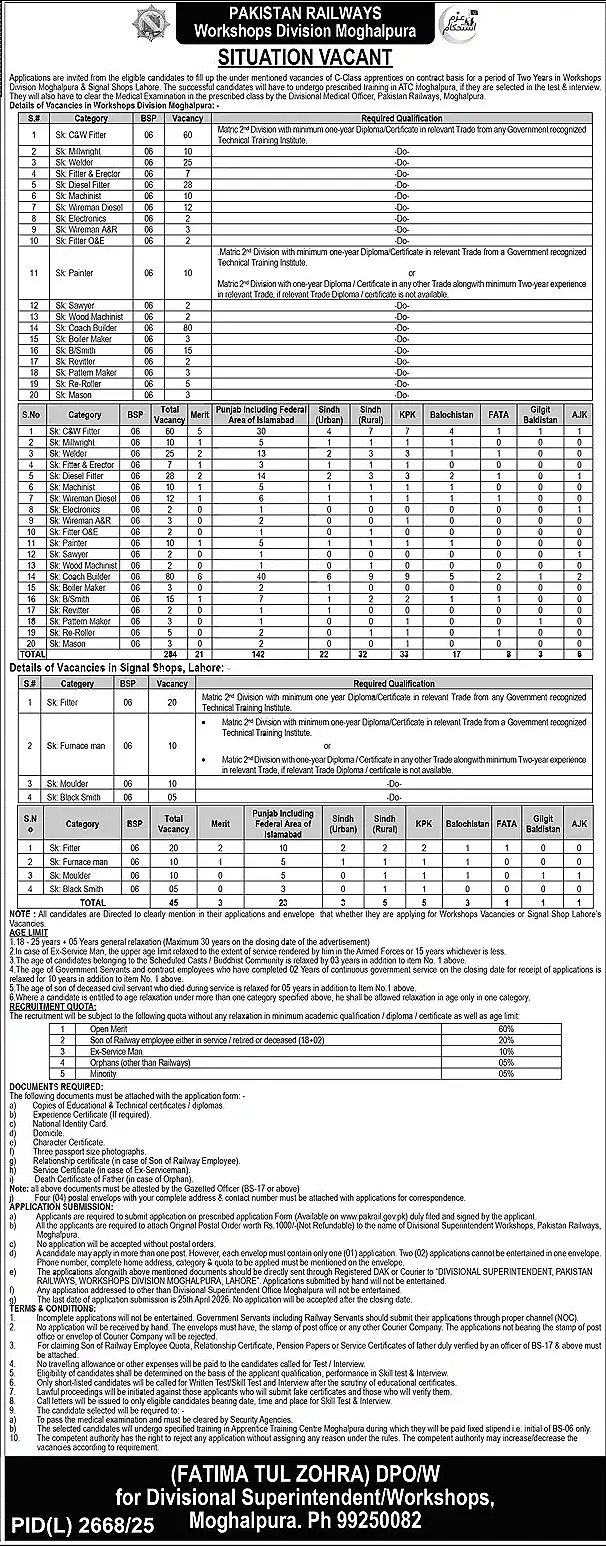Pakistan Railways has announced C-Class Apprenticeship Jobs 2026 in Workshops Division Moghalpura Lahore & Signal Shops Lahore.