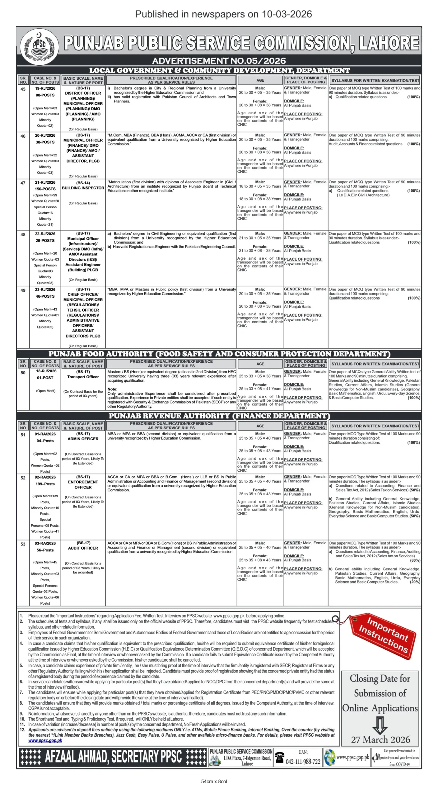 Punjab Public Service Commission has announced Advertisement No 05/2026 for multiple government vacancies in different departments of Punjab Government. These jobs are available in Local Government & Community Development Department, Punjab Food Authority and Punjab Revenue Authority.