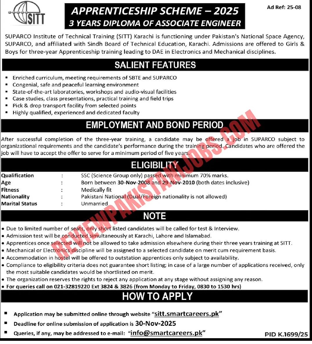 Applications must be submitted online at CLICK HERE The last date to apply is thirty November two thousand twenty five. For questions, applicants can contact the SITT office at 021 32819220 Ext 3824 and 3826 or email info@smartcareers.pk This apprenticeship is ideal for students interested in technical education, engineering careers, space technology training and high growth future job opportunities.