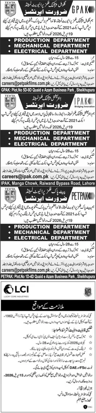 TEVTA Apprenticeship Jobs 2026 in Private Companies (GPAK, IPAK, PETPAK & Lucky Core Industries)
