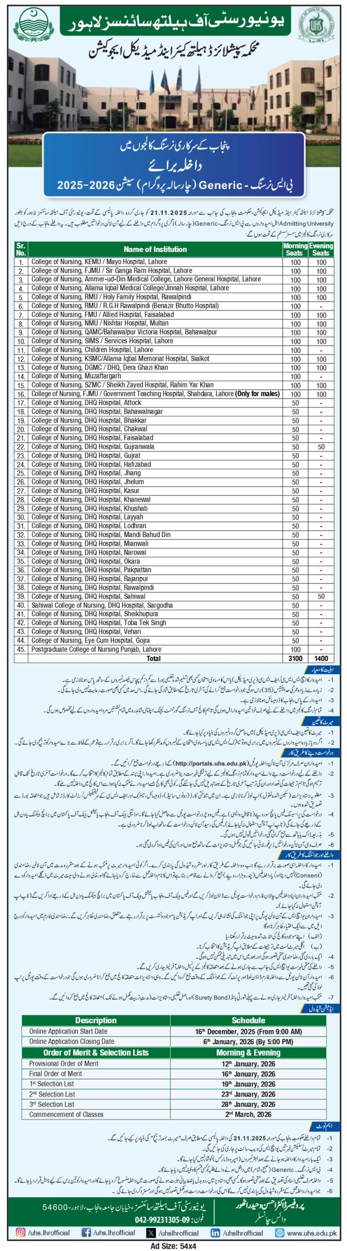 The University of Health Sciences (UHS) Lahore has officially announced BS Nursing Generic admissions for the academic session 2025–2026. These admissions are being offered under the supervision of the Specialized Healthcare and Medical Education Department, Government of Punjab, as per the admission policy issued on 21 November 2025.