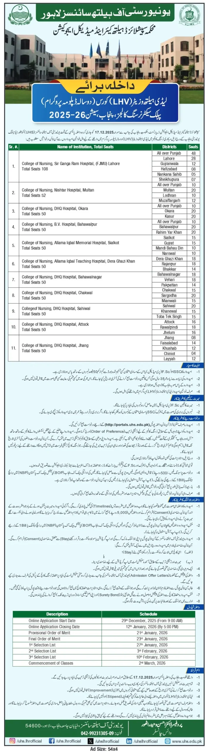 The University of Health Sciences (UHS) Lahore, under the Specialized Healthcare and Medical Education Department, Government of Punjab, has officially announced admissions for the Lady Health Visitor (LHV) Course 2025–26. This is a two year diploma program being offered in public sector nursing colleges across Punjab.