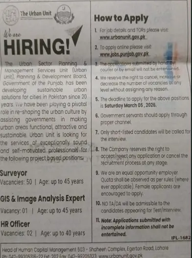 The Urban Sector Planning & Management Services Unit (Urban Unit) under the Planning & Development Board, Government of Punjab, is inviting applications from exceptionally skilled and self-motivated professionals for project-based positions. Urban Unit has been shaping sustainable urban solutions across Pakistan for over 20 years, assisting governments to make cities functional, attractive, and sustainable.